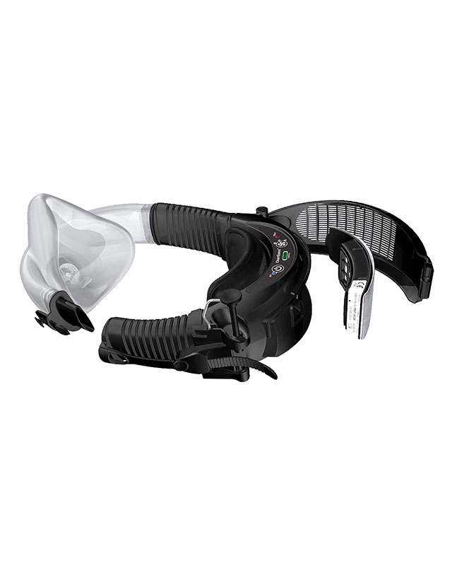 Lightweight and compact, CABLE-FREE, ergonomic neck-mounted design, adjustable, with exhalation valve facilitating breathing and user communication.